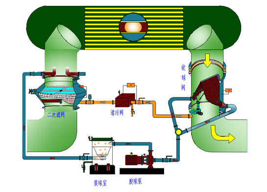 三、膠球清洗裝置工作原理 膠球清洗裝置選用合適的海綿膠球,球的濕態(tài)走徑比冷卻管內徑略大一點(diǎn)(約1—2mm)且濕態(tài)比重和水相近。將膠球從裝球室手孔處投入裝球室內,數量為凝汽器進(jìn)水室銅管數的10%左右。然后啟動(dòng)膠球泵,打開(kāi)系統兩端球閥,膠球就在此循環(huán)水進(jìn)口壓力略高一些的水流帶動(dòng)下,進(jìn)入凝汽咕嘟水室。因膠球是一個(gè)多微柔軟的彈性體,在循環(huán)水進(jìn)出口壓力差的作用下被擠壓通過(guò)冷卻管,對冷卻管內徑進(jìn)行一次抹擦,使管內壁污垢隨水流帶出,膠球循環(huán)水經(jīng)過(guò)水管進(jìn)入收球網(wǎng),在收球網(wǎng)板的阻攔下,把膠球分離出來(lái),由膠球泵抽出重新回到膠球室,如此循環(huán)往復對凝汽器冷卻管實(shí)現連續清洗。 四、膠球清洗裝置系統圖  |