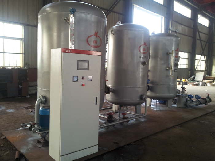 新型等量過(guò)濾式除氧器的結構形式。它是由(1)外殼(2)旋膜器(3)沖洗裝置(4)快速排污口(6)淋水器(7)不銹鋼蓄熱填料(8)蒸汽等量分配器(9)上封頭及相關(guān)管口焊接制作。 1.外殼:是由筒身和兩個(gè)沖壓橢圓形封頭上下焊接制成。 2.旋膜器:由兩個(gè)水室、旋膜管、凝結水接管、補充水接管、(3)沖洗裝置(4)快速排污口備用口管組成。 旋膜管是旋膜式除氧器的突出要點(diǎn),旋膜管長(cháng)度決定除氧器效果好與差。旋膜管上打有直徑4.9mm 的螺旋形狀小孔 10個(gè),設有計量的若干個(gè)旋膜管在同等的壓力下做功,水至旋膜管外向內壁旋轉,形成水膜裙,水膜裙象紙一樣薄。容易被蒸汽加熱到飽和溫度,水在旋膜管內的做功的時(shí)間是噴霧填料式除氧器的五倍,也就決定了旋膜的理論數據:起點(diǎn)軸據為 x mm 。 凝結水、化學(xué)補水、其它回水經(jīng)旋膜管呈螺旋狀按一定的角度噴出,形成水膜裙,并與加熱蒸汽在旋膜管內充分熱交換,加熱蒸汽是由下向上,經(jīng)不銹鋼填料層、淋水器向升把旋膜管的水膜裙加熱到工作壓力下的飽和溫度,除去給水的百分之九十五的氧。 3.淋水器:是由數層交錯排列的角形鋼制件組成,經(jīng)旋膜器粗除氧的給水、疏水在這里混合進(jìn)行二次分配,呈均勻淋雨狀落到裝在其下的不銹鋼填料網(wǎng)上。 4.不銹鋼填料層:學(xué)名為蓄熱器,是由相互間隔的扁鋼帶及一個(gè)圓簡(jiǎn)體組成,內裝一定高度特制的不銹鋼網(wǎng),給水在這里與蒸汽充分接觸,加熱到飽和溫度進(jìn)行深度除氧,以保證除氧水的含量:低壓大氣式除氧器低于≤30ug/L。 改造效益 1臺50t/h除氧器的整套改費用大約需要十萬(wàn)元左右。 綜合分析1臺50t/h除氧器每年節約新蒸汽經(jīng)費大約三十萬(wàn)元人民幣; 改造后除氧器出水溶解氧≤15ug/L,